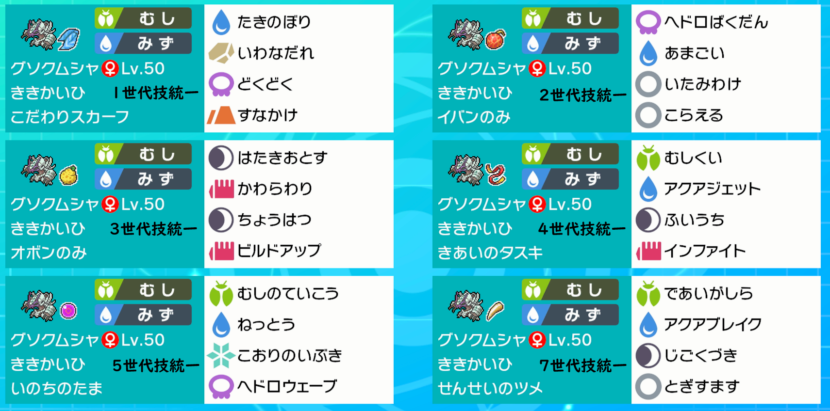 最初は「過去作限定技絶対採用+木の実限定」という技制限をしようと思っていたが、先月開催された技世代統一の制限が面白そうだったので「各世代で初出の技統一」に変更。