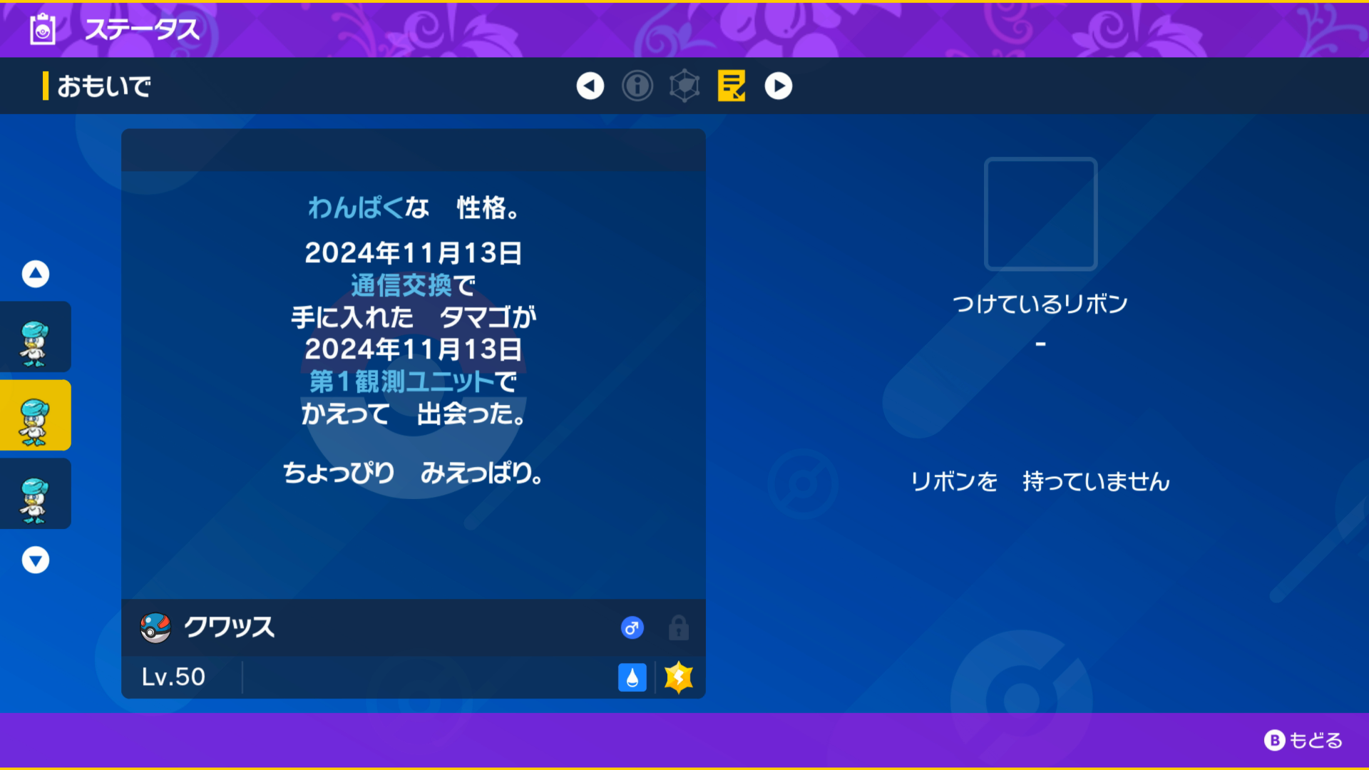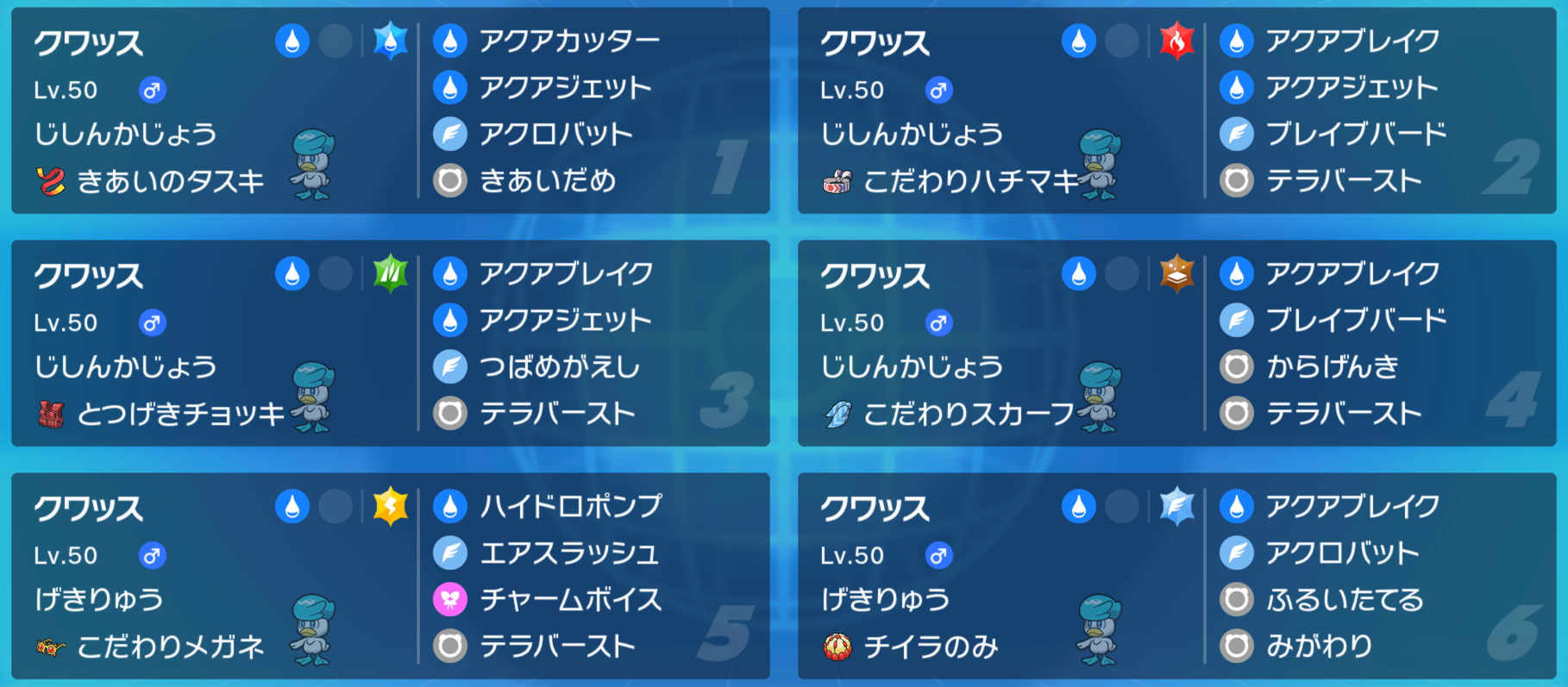 最初はクワッスを使う予定は無かったが、ポケモンGOでクワッスのコミュニティデイが開催され色違いを複数手に入れることができたため統一を組むことにした。