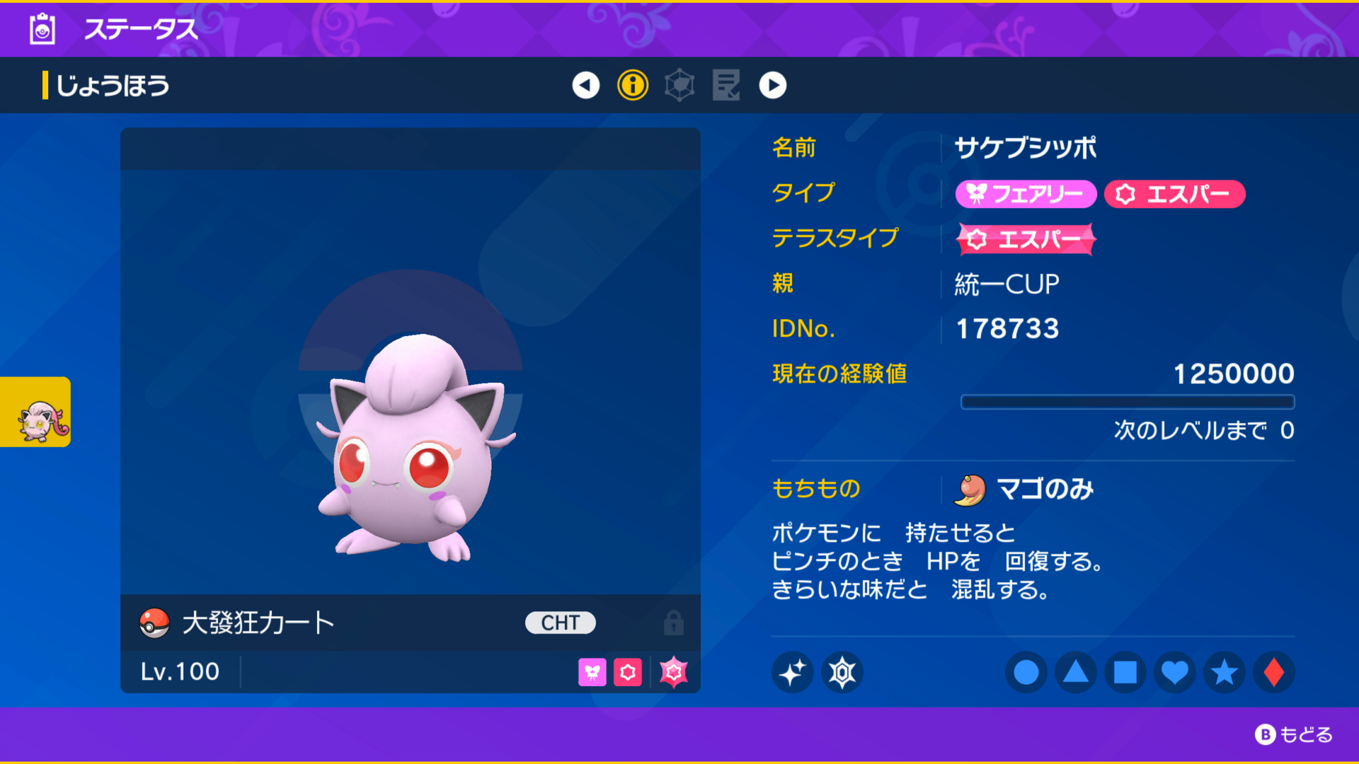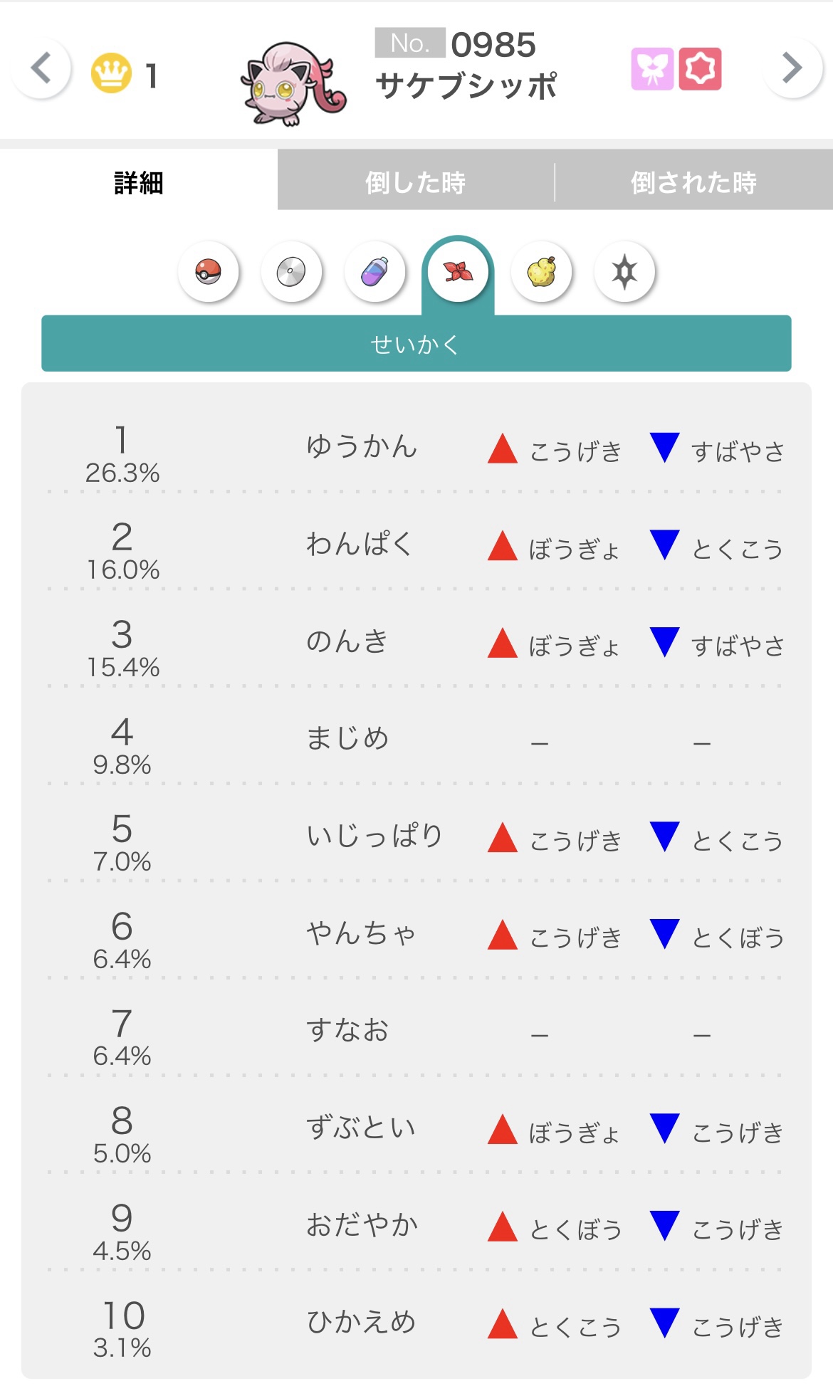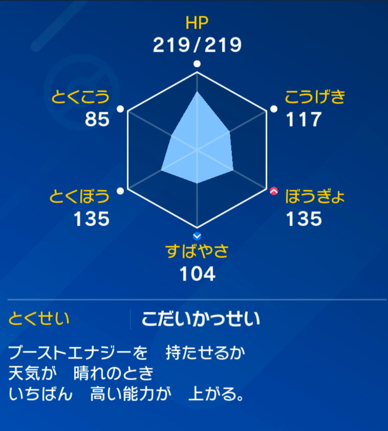 性格:おっとり+のんきミント使用(自然遭遇した個体を使用しているため元の性格は無補正ではない)