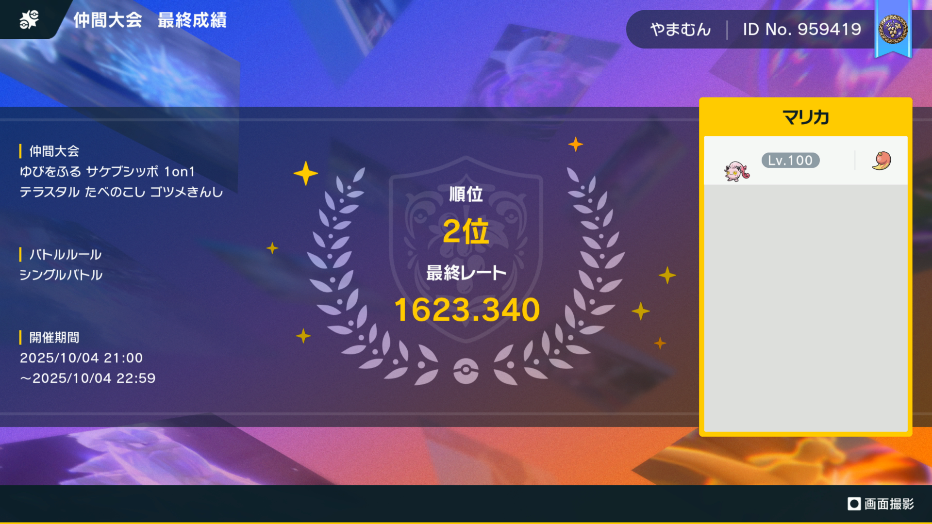 11戦目:ザシアン1体のみの違反者。時間いっぱいまで放置して「きょじゅうざん」で負け。(レート補填+16)