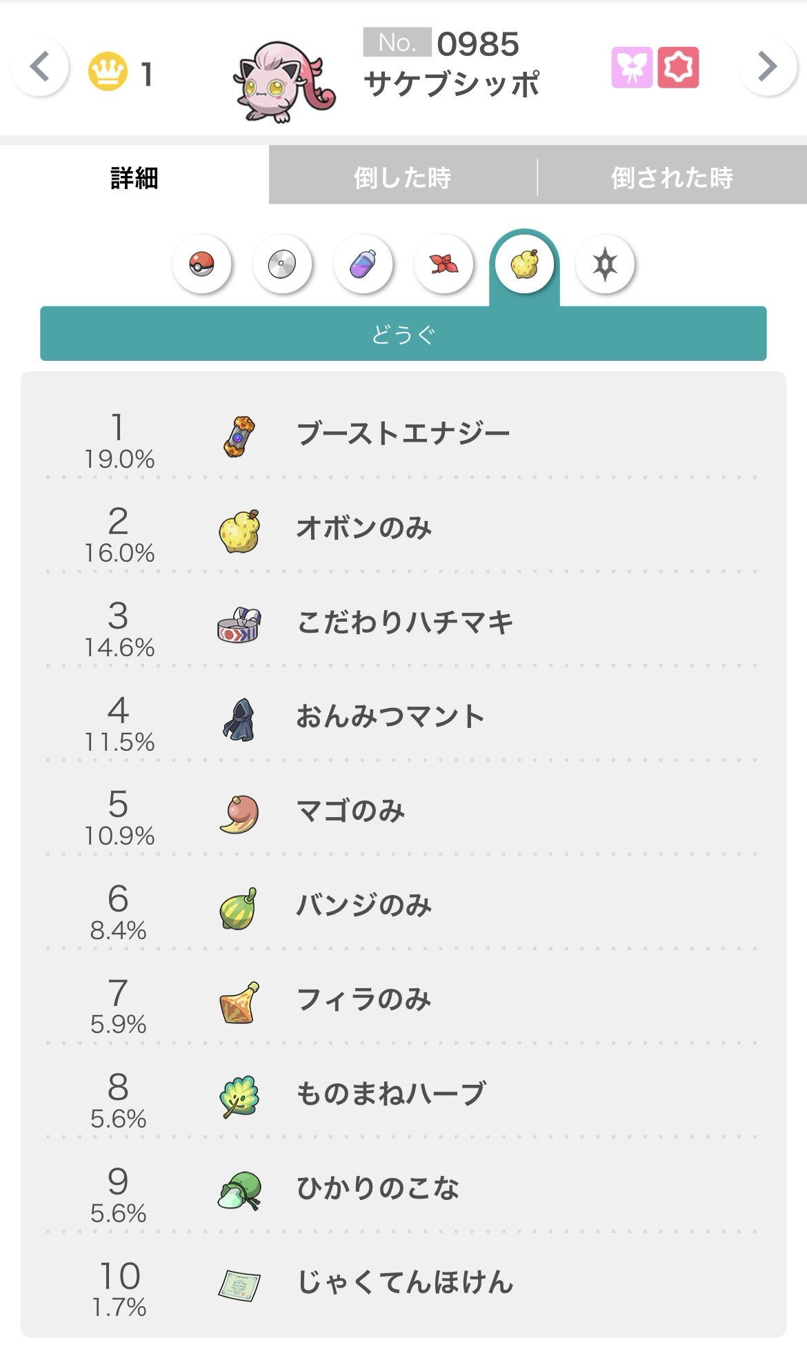 ・HOMEの結果によると持ち物採用率はブーストエナジーが1位のようだが、自分が当たった範囲ではブーストエナジー持ちは少なく判明したのは木の実、隠密マント、ものまねハーブのみ。