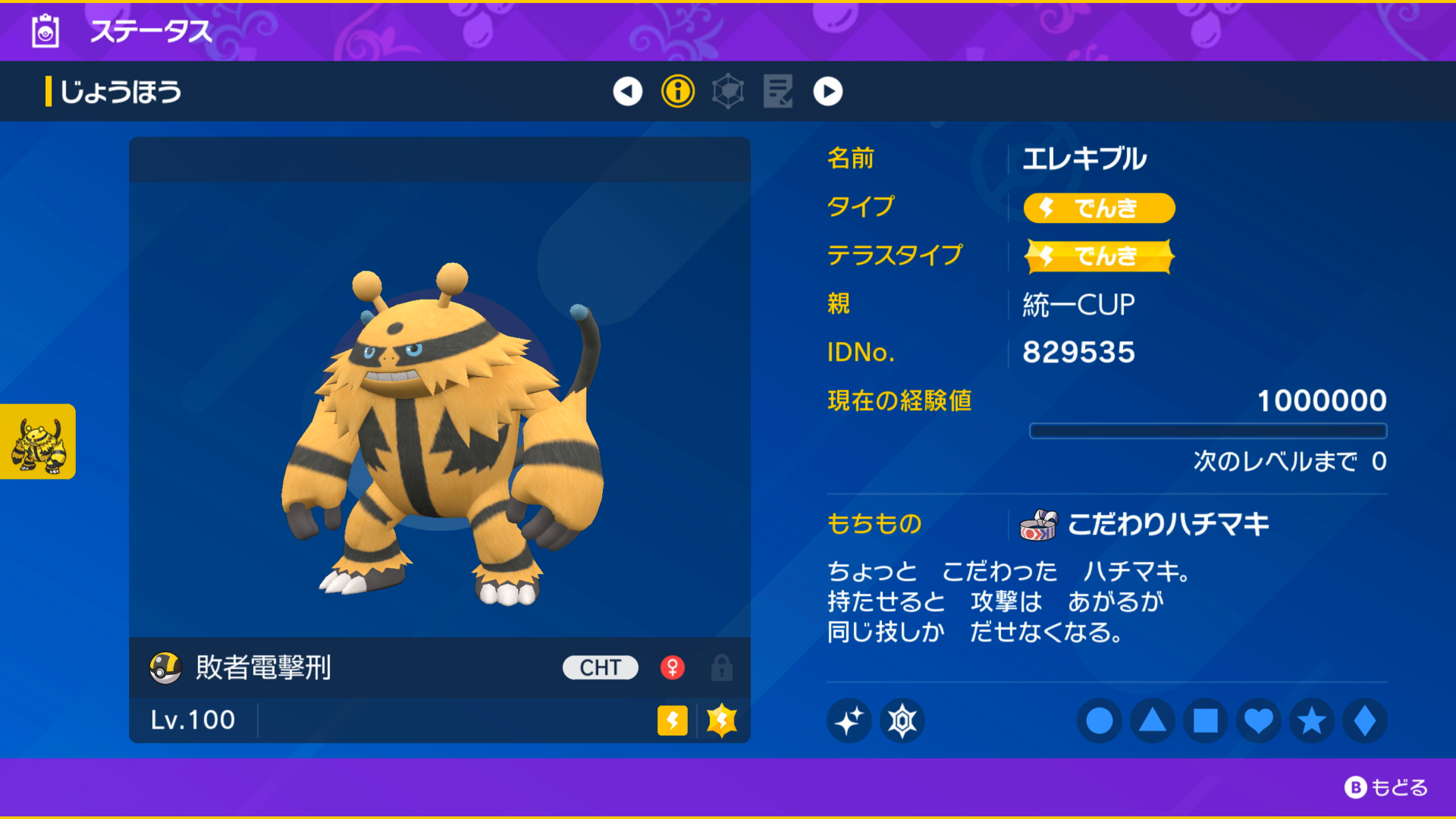 A 拘り鉢巻込み「ぶちかまし」でHB特化エレキブル確定1発(236振り以下は乱数で耐えられる)