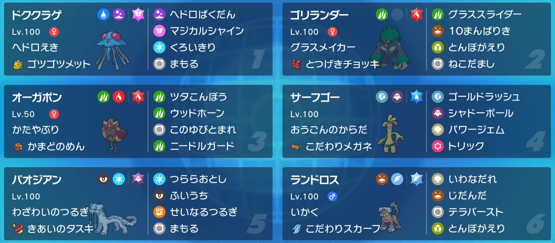選出:ドククラゲ、霊獣ランドロス、パオジアン、ゴリランダー