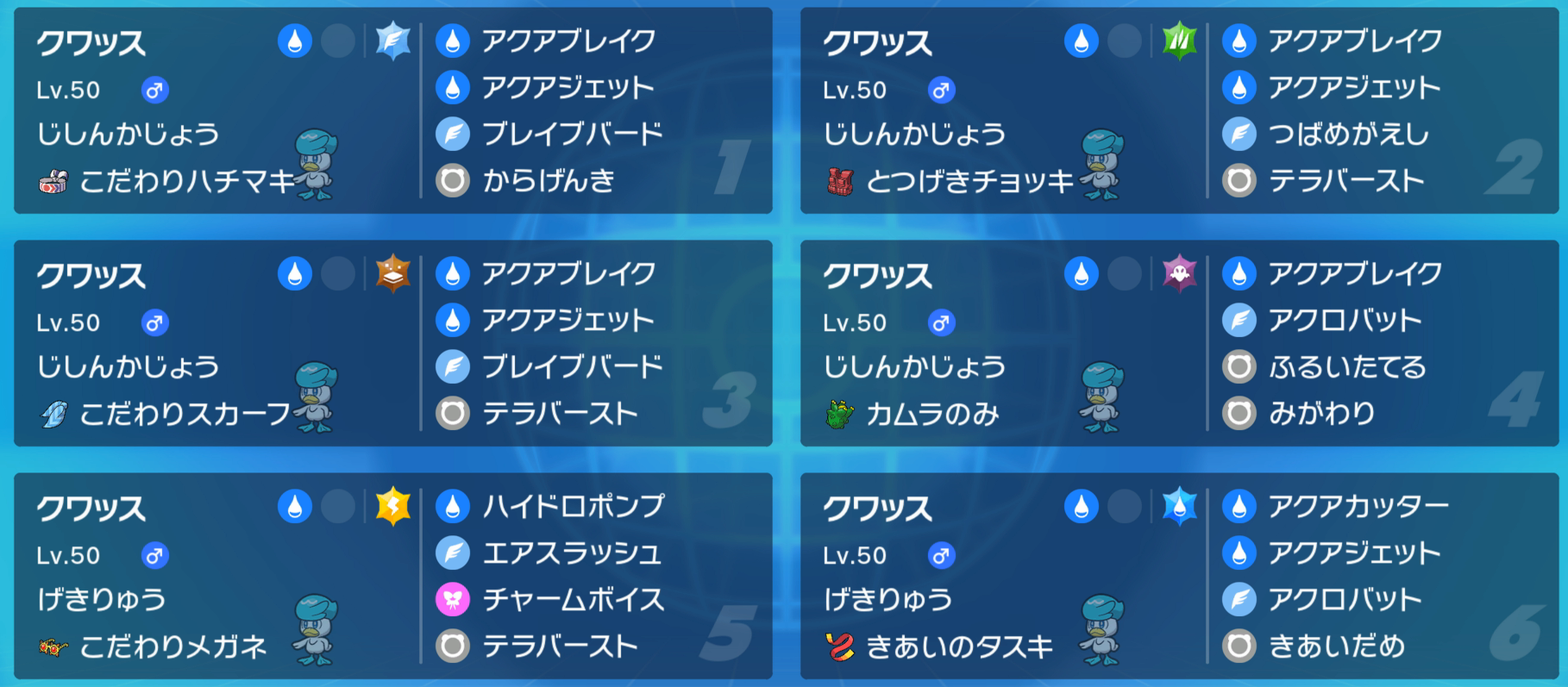 自信過剰の場合、クワッスより速い相手に初手の削りで「アクアジェット」圏内+タスキの行動保障でほぼ確実に2体以上の突破が狙える。